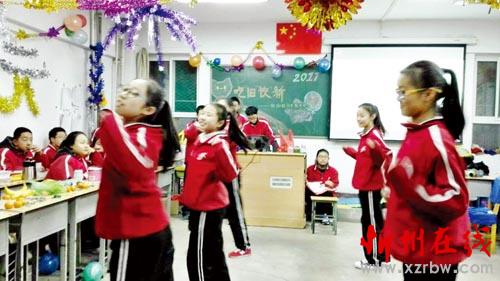 聯(lián)歡會(huì)由各班學(xué)生自己精心組織、排練,并由學(xué)生自主開(kāi)展。同學(xué)們熱情高漲,積極參與,充分發(fā)揮自己的特長(zhǎng),表演自己最拿手的節(jié)目。每位同學(xué)都積極參與,每個(gè)人都成了“明星大腕”。班級(jí)聯(lián)歡會(huì)內(nèi)容豐富、精彩紛呈,舞蹈、歌曲、相聲、小品、游戲等節(jié)目一一亮相,喜慶祥和的氛圍濃厚強(qiáng)烈。圖為初二210班學(xué)生正在進(jìn)行節(jié)目表演。(郝江峰 攝)
