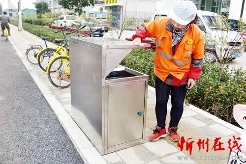 記者從市環(huán)衛(wèi)處了解到,為提高環(huán)境衛(wèi)生管理水平,美化城區(qū)環(huán)境,市環(huán)衛(wèi)處將在城區(qū)部分新修、新改建的主次干道兩旁、家屬院門口及部分服務單位,分批次更換220個新型垃圾桶。目前新增配更換的垃圾桶主要集中在長征街、團結(jié)街、利民街等新修路段。圖為環(huán)衛(wèi)工人正在對垃圾桶進行維護。(張志遠攝)