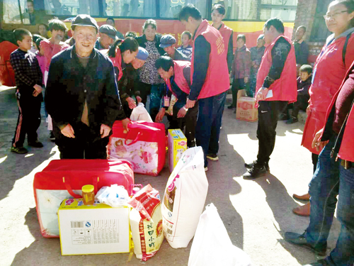 深秋的早晨伴著涼風,空氣中帶著絲絲冷意,志愿者們乘坐的中巴車緩緩地駛入蘆草溝村。中巴車還沒停穩(wěn),在村口曬太陽的村民就都圍了過來。當村民們得知志愿者的來意后,非常感謝志愿者的愛心幫助。此時大家一鼓作氣將車上帶來的慰問品搬了下來,分類后開始分發(fā)。本次活動主要探望的是該村的13戶孤寡老人,慰問物品包括每人一桶油、一袋面、一袋米以及食鹽、醬油、醋等生活必需品。志愿者還為當?shù)氐膬和瘻蕚淞诵聲约胺篮^冬的衣服。經(jīng)過一個小時的忙碌,慰問品分發(fā)完畢。