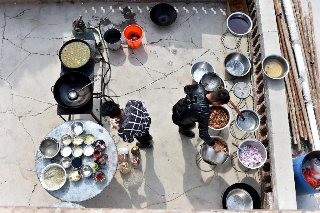 ↑在山西省壺關(guān)縣五龍山鄉(xiāng)水池村,村民請來的廚師在為重陽節(jié)老人宴會準(zhǔn)備菜品(10月13日攝)。