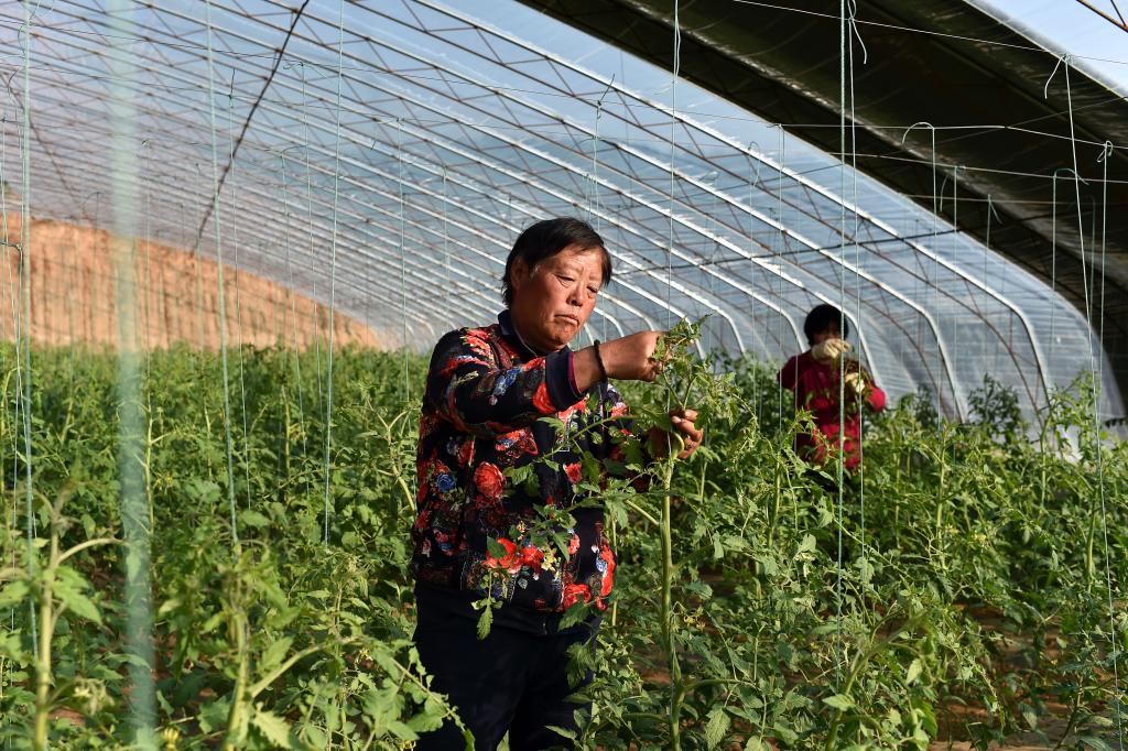 ↑在壺關(guān)縣五龍山鄉(xiāng)水池村,村民在蔬菜大棚里忙碌(10月12日攝)。