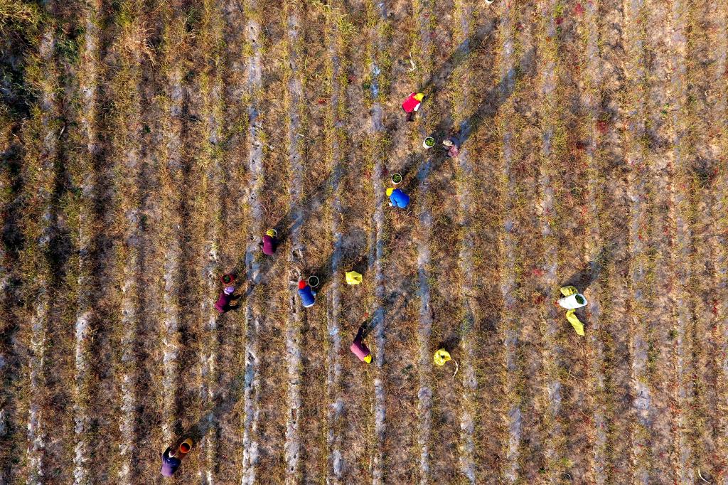 ↑在壺關(guān)縣五龍山鄉(xiāng)水池村,村民在辣椒園里采摘辣椒(10月11日無人機(jī)拍攝)。