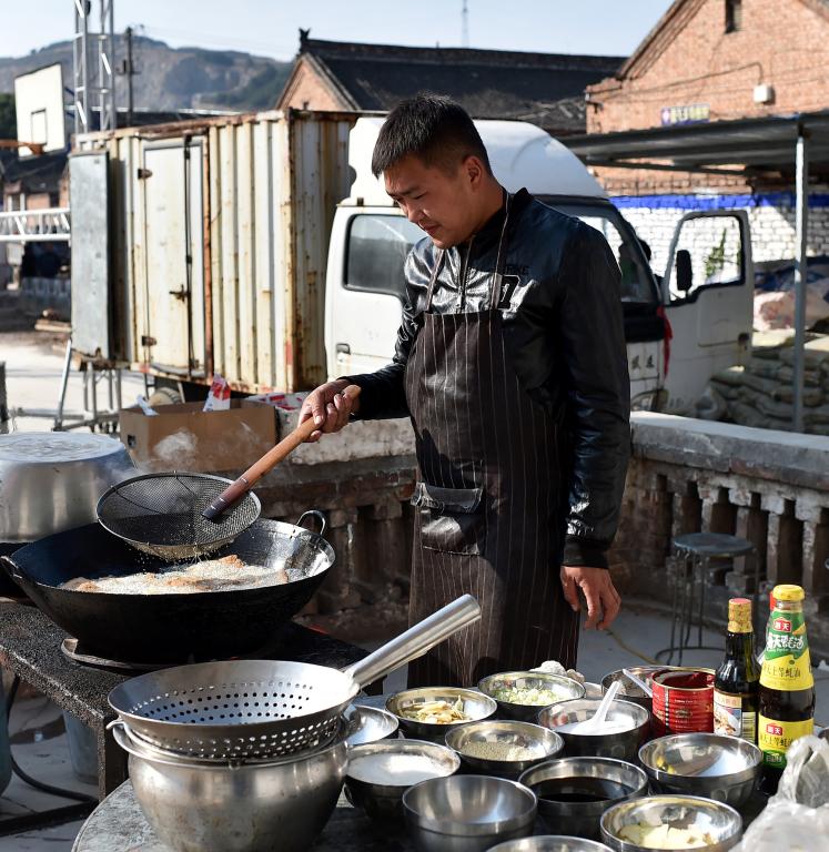 ↑在壺關(guān)縣五龍山鄉(xiāng)水池村,村民請來的廚師在為重陽節(jié)老人宴會準(zhǔn)備菜品(10月13日攝)。
