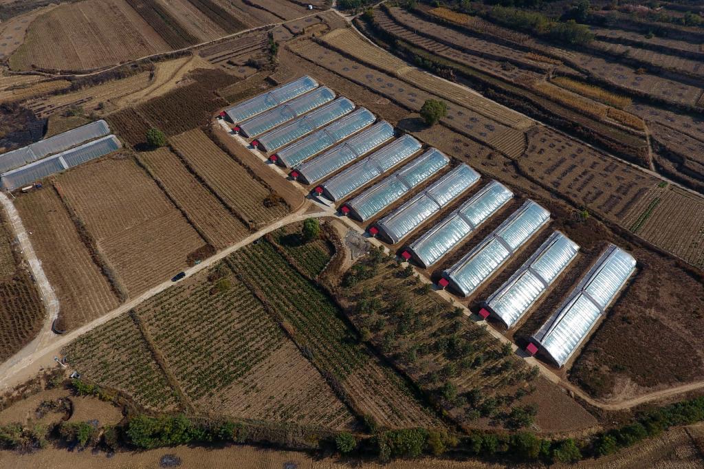 ↑壺關(guān)縣五龍山鄉(xiāng)水池村的蔬菜大棚(10月12日無人機(jī)拍攝)。