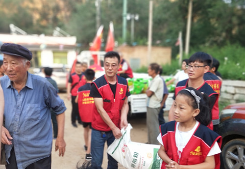 在發(fā)放現(xiàn)場,受災(zāi)群眾感受到了志愿者的關(guān)愛,看在眼里,暖在心里,整個(gè)村里呈現(xiàn)出一片溫馨快樂的氛圍。