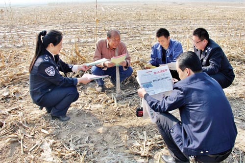為了將《中華人民共和國大氣污染防治法》和《五臺縣人民政府嚴防森林火災的通告》宣傳到戶、到人,五臺縣環(huán)保局組織工作人員,分組劃片深入到田間地頭,面對面讀報給農民聽,為農民解釋燒秸稈、燒荒等野外違規(guī)用火行為的危害。臺城鎮(zhèn)西關村66歲的農民張存在說:“你們這樣解釋,咱懂。我家4畝地的秸稈保證不燒一根。”圖為五臺縣環(huán)保局工作人員在田間地頭宣傳環(huán)境保護相關知識。(金俊賢 辛宇 攝影報道)