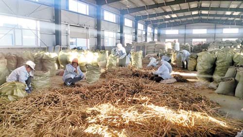當?shù)剞r(nóng)民在產(chǎn)業(yè)孵化園倉房內(nèi)分揀黃芪藥材