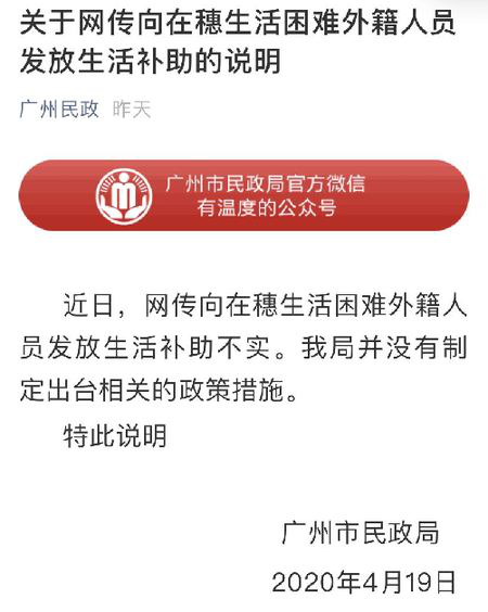 真相:廣州市民政局19日發(fā)表說明:近日,網(wǎng)傳向在穗生活困難外籍人員發(fā)放生活補(bǔ)助不實(shí)。我局并沒有制定出臺相關(guān)的政策措施。
