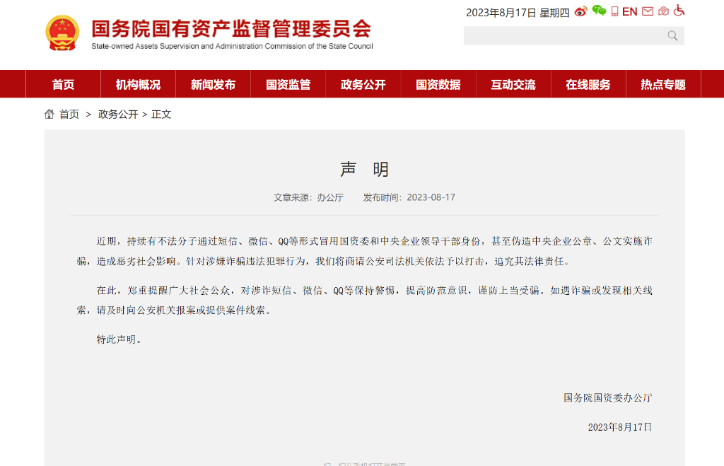 國務(wù)院國資委發(fā)布聲明打假 提醒公眾提高防范意識