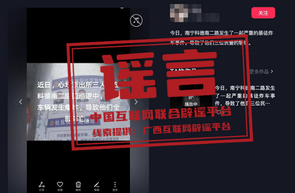 真相:近期,有網(wǎng)民在短視頻平臺(tái)上發(fā)布視頻稱“某派出所三人在路口巡邏中,突然車輛發(fā)生爆炸,導(dǎo)致三位民警全部犧牲”。經(jīng)南寧公安部門調(diào)查,該信息為謠言。網(wǎng)民韋某為吸引關(guān)注,杜撰此條謠言信息,并利用手機(jī)進(jìn)行發(fā)布。根據(jù)《中華人民共和國治安管理處罰法》第二十五條,屬地公安機(jī)關(guān)已依法對(duì)韋某處以行政處罰。(來源:廣西互聯(lián)網(wǎng)辟謠平臺(tái)、南寧網(wǎng)警)