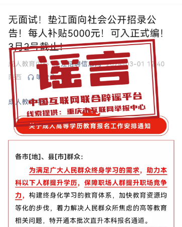 真相:近日,“墊江招聘信息網(wǎng)”微信公眾號發(fā)布信息:“無面試!重慶墊江面向社會公開招錄公告!每人補貼5000元!可入正式編!”部分網(wǎng)民看到該信息后誤認為,墊江面向社會以補貼形式招錄具有正式編制的公務(wù)人員,于是紛紛向墊江縣有關(guān)部門致電咨詢招錄情況。經(jīng)核實,近年來,墊江未曾以補貼方式和不經(jīng)過面試招錄具有正式編制公務(wù)人員。該信息實則為成人學歷提升培訓信息,而非正式編制公務(wù)人員招錄信息。墊江縣互聯(lián)網(wǎng)信息辦公室已依法對發(fā)布該信息的微信公眾號負責人進行約談和教育批評,指出虛假信息的危害性,并責令刪除相關(guān)信息。(來源:重慶辟謠)