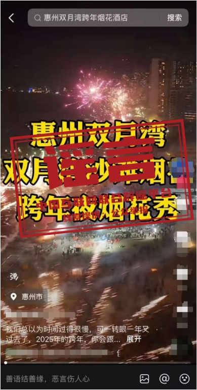 真相:近期,網(wǎng)絡(luò)上出現(xiàn) “廣東惠州雙月灣2025跨年煙花秀”“2025雙月灣跨年倒數(shù)夜”“雙月灣跨年煙花秀”等信息,引發(fā)關(guān)注。經(jīng)相關(guān)部門(mén)核實(shí),網(wǎng)傳信息均系不實(shí)信息。目前廣東省惠州市惠東縣雙月灣沒(méi)有舉辦2025年跨年煙花秀活動(dòng)的安排,請(qǐng)廣大游客不聽(tīng)謠、不信謠、不傳謠,一切以官方發(fā)布信息為準(zhǔn)。(來(lái)源:“惠州日?qǐng)?bào)”微信公眾號(hào)、惠東文旅體)