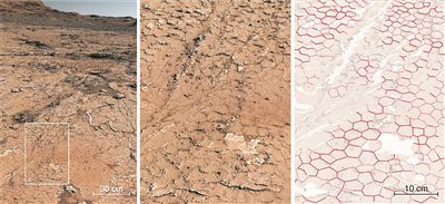 “好奇”號(hào)在穿越火星蓋爾隕石坑的第3154天分析了沉積巖中的六角形化石圖案。圖片來源:《自然》雜志