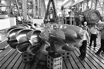 圖為東方電機國內(nèi)首臺自主研制的單機容量最大功率150兆瓦級沖擊式水電機組轉(zhuǎn)輪。 資料照片