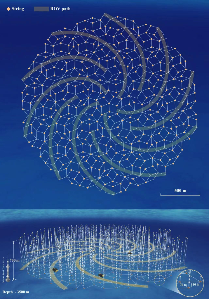 根據(jù)設計,這些線纜像巨型海藻一樣垂直地錨定于海床上,每根長約700米,互相間距70米至110米。每根線纜搭載約20個光學探測球艙,如同深海中的一串串鈴鐺,靜待高能中微子的到來。