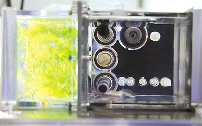 在問天艙生命生態(tài)實驗柜小型受控生命生態(tài)實驗?zāi)K中,魚類、植物和微生物協(xié)同參與——藻類光合作用產(chǎn)生的氧氣供斑馬魚呼吸,魚呼出的二氧化碳供藻類進行光合作用,進食產(chǎn)生的糞便則提供了藻類生長的養(yǎng)料。在飲食方面,科學(xué)家專門設(shè)計了魚食,用注射器推進“魚缸”。