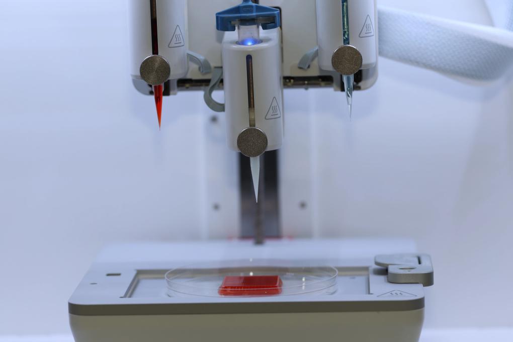 南京農(nóng)業(yè)大學(xué)肉品質(zhì)量控制與新資源創(chuàng)制全國(guó)重點(diǎn)實(shí)驗(yàn)室、國(guó)家肉品質(zhì)量安全控制工程技術(shù)研究中心,3D生物打印細(xì)胞培養(yǎng)肉技術(shù)展示。新華社記者 趙久龍 攝