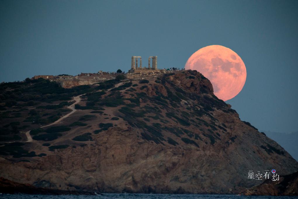 2023年8月30日,“超級(jí)月亮”從希臘蘇尼翁角的波塞冬廟上空升起。新華社發(fā)(馬里奧斯·羅洛斯攝) 當(dāng)月球和太陽處于地球兩側(cè),并且月球和太陽的黃經(jīng)相差180度時(shí),地球上看到的月球最圓,被稱為“滿月”,亦稱為“望”。農(nóng)歷每月的十四、十五、十六甚至十七,都是滿月可能出現(xiàn)的時(shí)段。