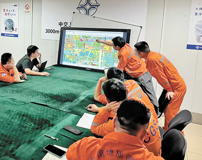 “夢想”號(hào)指揮部主要負(fù)責(zé)人周昶(前)在動(dòng)力控制室查看船上情況。 中國地質(zhì)調(diào)查局宣傳教育中心供圖