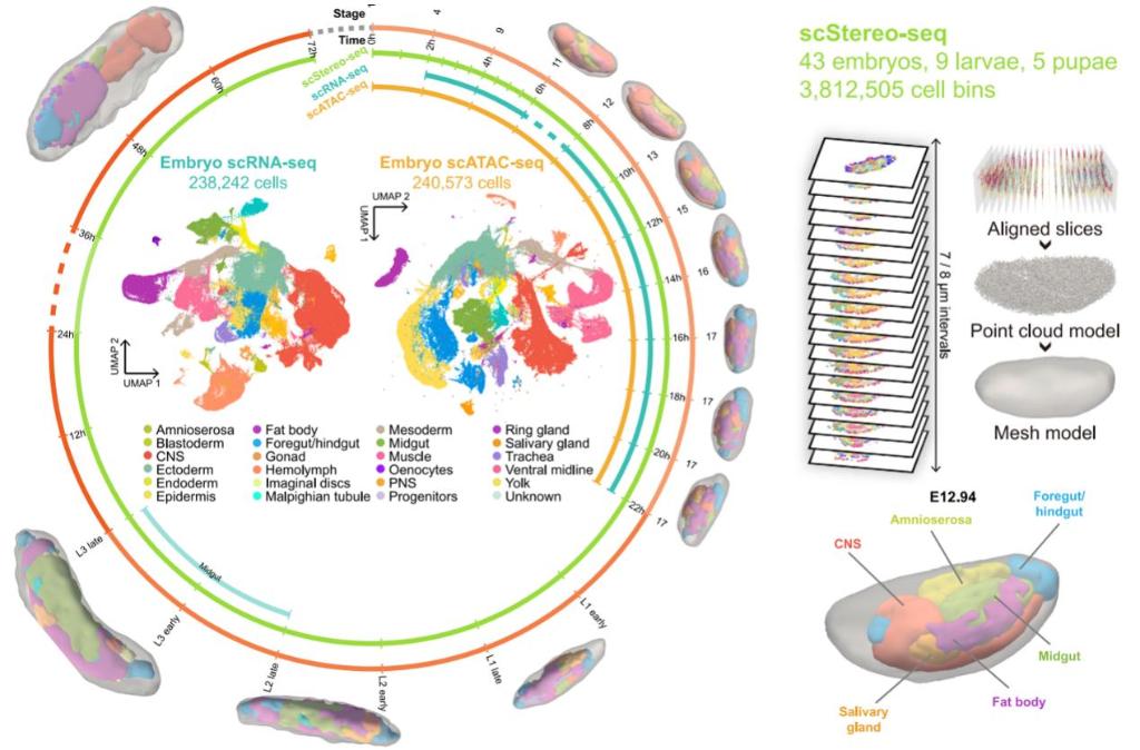 杭州華大生命科學研究院與南方科技大學創(chuàng)建了一個解碼動物發(fā)育過程的多模態(tài)數(shù)據(jù)集,生成了果蠅全發(fā)育周期的3D單細胞時空多組學圖譜,為生物發(fā)育提供了分子層面的參考,有望為發(fā)育缺陷及相關疾病機制研究奠定基礎。相關成果26日發(fā)表于國際學術期刊《細胞》。