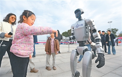 10月25日,江蘇省揚(yáng)州市公安局在揚(yáng)州市明月湖廣場(chǎng)舉行警營(yíng)開(kāi)放日活動(dòng),現(xiàn)場(chǎng)設(shè)立多個(gè)主題互動(dòng)展區(qū),市民可以近距離接觸警務(wù)裝備。圖為人形機(jī)器人與小朋友互動(dòng)。孟德龍攝(人民視覺(jué))
