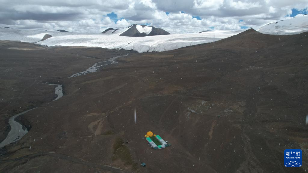 第二次青藏科考海拔最高的冰川末端大營——普若崗日冰原科考主營地(無人機(jī)照片)。新華社記者 劉詩平 攝