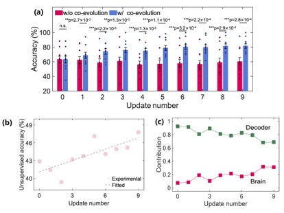 (a)協(xié)同演進腦機解碼正確率較初始狀態(tài)提高20%;(b)任務相關(guān)腦電特征發(fā)生正向演化;(c)腦與憶阻器解碼器實現(xiàn)互適應。(聯(lián)合研究團隊供圖)