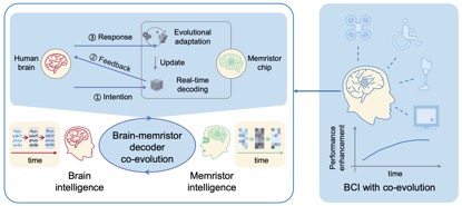 天津大學與清華大學的聯(lián)合研究團隊針對這一難題,發(fā)現(xiàn)腦電信號的非平穩(wěn)特性與任務腦電演變密切相關(guān)?;诖?,他們創(chuàng)新性地提出了“雙環(huán)路腦機協(xié)同演進框架”,并通過憶阻器神經(jīng)形態(tài)器件加以實現(xiàn)。在“雙環(huán)路”框架下,腦與機的學習環(huán)路相互協(xié)同,共同促進系統(tǒng)性能的提升。