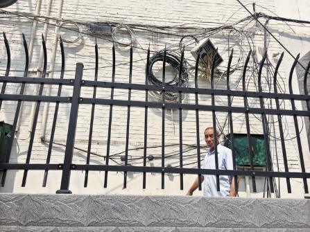 記者在位于該路口的市化工局宿舍樓側面墻上看到布滿“蛛網(wǎng)”般的電線,藕斷絲連,錯綜復雜。小區(qū)住戶劉大爺告訴記者,這堵墻上的電線種類繁多復雜,最要緊的是其中的高壓電線固定在距離地面只有1米至1.5米左右的墻上,電線外面的PVC保護管已經(jīng)因年久失修嚴重老化,電線直接裸露在外,遇上下雨打雷天氣非常危險,平時小孩玩耍路過也不安全。據(jù)記者觀察,在距離這堵墻約兩米的地方有1根電線桿,宿舍樓墻上離地面最近的4根黑色電線就是從這根電桿上接進來的,電線橫搭部分基本暴露在外,特別不安全。小區(qū)居民希望相關部門能夠盡快消除隱患,給居民們一個安全放心的居住環(huán)境。