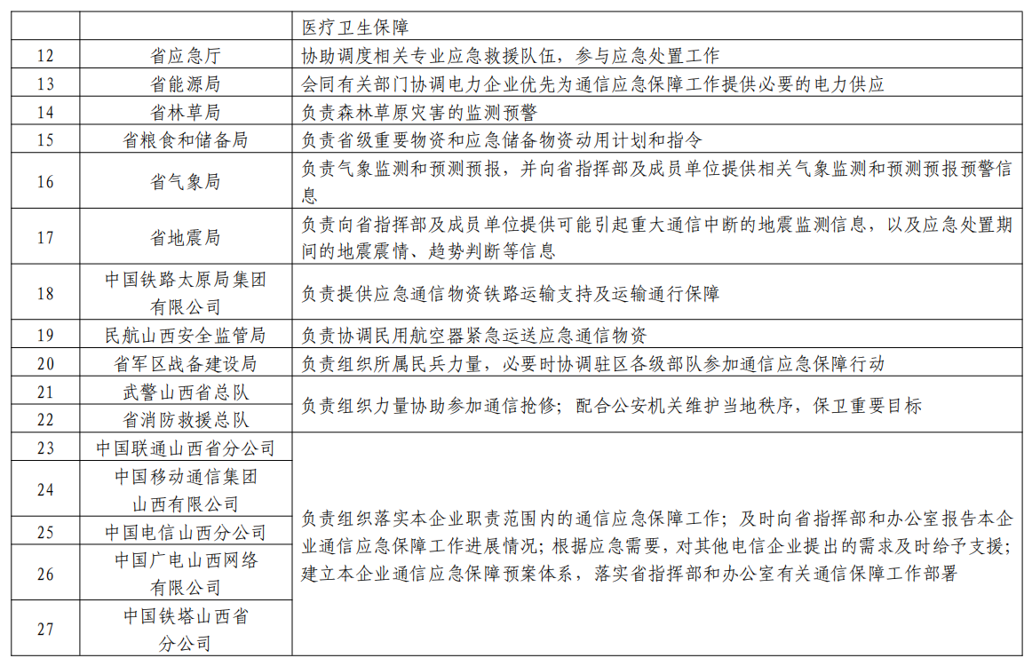 成員:省通信管理局、省委宣傳部、省委網(wǎng)信辦、省發(fā)展改革委、省公安廳、省財政廳、省自然資源廳、省交通廳、省水利廳、省衛(wèi)健委、省應(yīng)急廳、省能源局、省林草局、省糧食和儲備局、省氣象局、省地震局、中國鐵路太原局集團有限公司、民航山西安全監(jiān)管局、省軍區(qū)戰(zhàn)備建設(shè)局、武警山西省總隊、省消防救援總隊以及省基礎(chǔ)電信企業(yè)等部門單位相關(guān)負(fù)責(zé)人。
