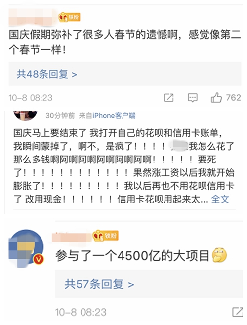 不少網(wǎng)友開始討論“十一”黃金周消費(fèi)情況。微博截圖