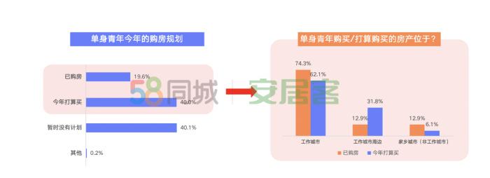 報告顯示,單身人群中有19.6%的人表示目前已購房。他們之中,選擇在工作城市買房的單身青年占比74.3%,在工作城市周邊買房的人群占比12.9%,另有12.8%的已購房單身青年回到家鄉(xiāng)城市(非工作城市)買房。