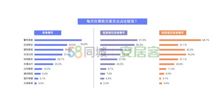 吃,是一大生活樂趣來源。報告顯示,63.8%的單身青年表示每月在餐飲美食上的花銷占比較高。此外,住房物業(yè)、服飾美容、生活日用等方面也是單身青年的主要開銷。