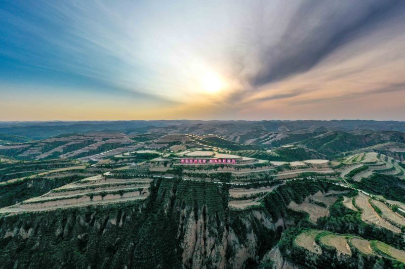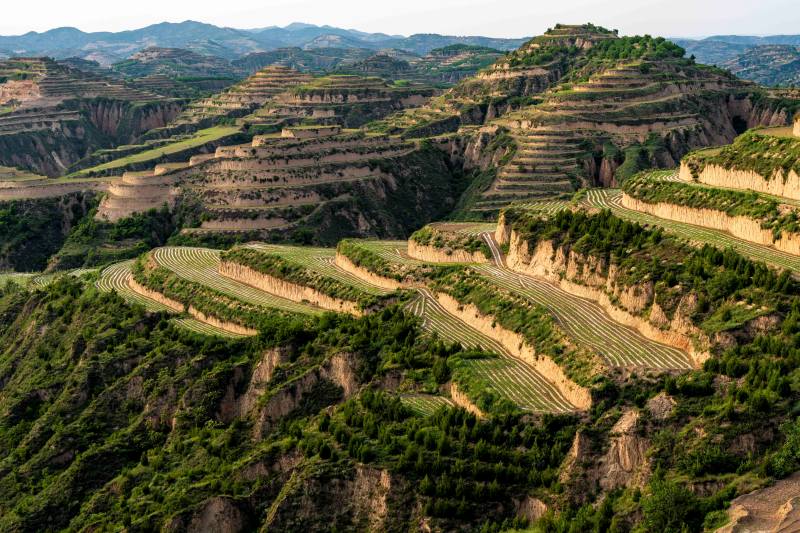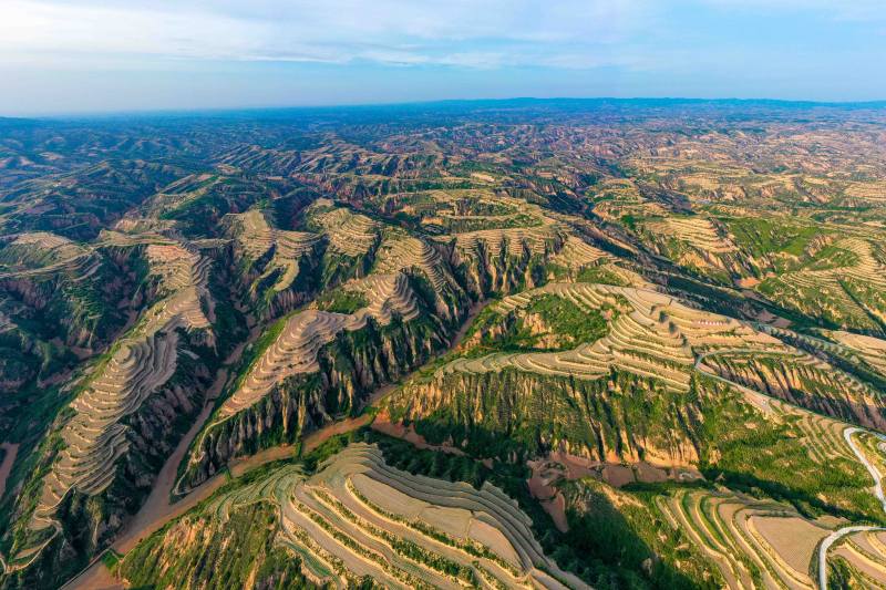 站在永和梯田觀景臺(tái)上,一壟壟地膜像一條條白色的絲帶,纏繞在層層疊疊的梯田間。連綿的山坡間、山塬上,鋪滿了綠色的盛裝——油松、連翹,還有地里的高粱苗,正孕育著無限的生機(jī)活力。