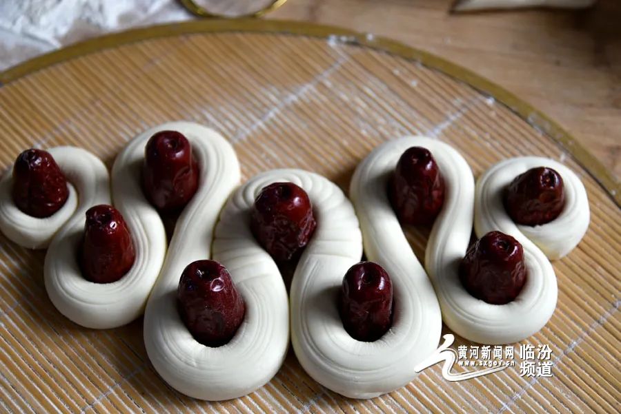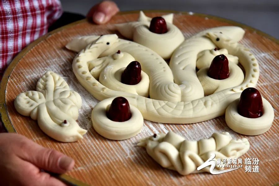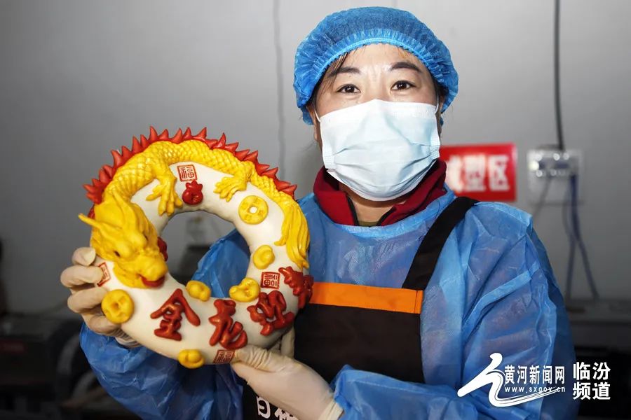 在晉南,蒸花饃是不可缺少的一項(xiàng)年俗?;x藝人用面粉、果蔬汁、雞蛋和牛奶等食材為原料,巧手捏制出“金龍迎春”“迎春納福”等寓意吉祥的系列花饃,為即將到來(lái)的龍年春節(jié)增添了濃濃的年味。