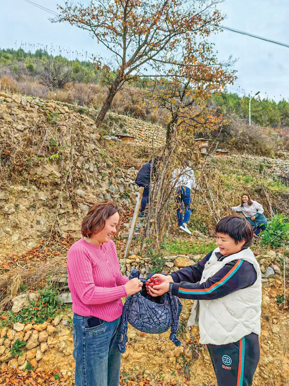 徜徉在小路上,偶遇從河南新鄉(xiāng)長(zhǎng)垣市自駕而來(lái)的游客于女士一行人,她們正在山坡上采摘?jiǎng)倓偸焱傅纳介?。于女士告訴記者,她們這幾個(gè)鄰居經(jīng)常自駕來(lái)松廟村游玩,夏天時(shí)還常在村里小住。