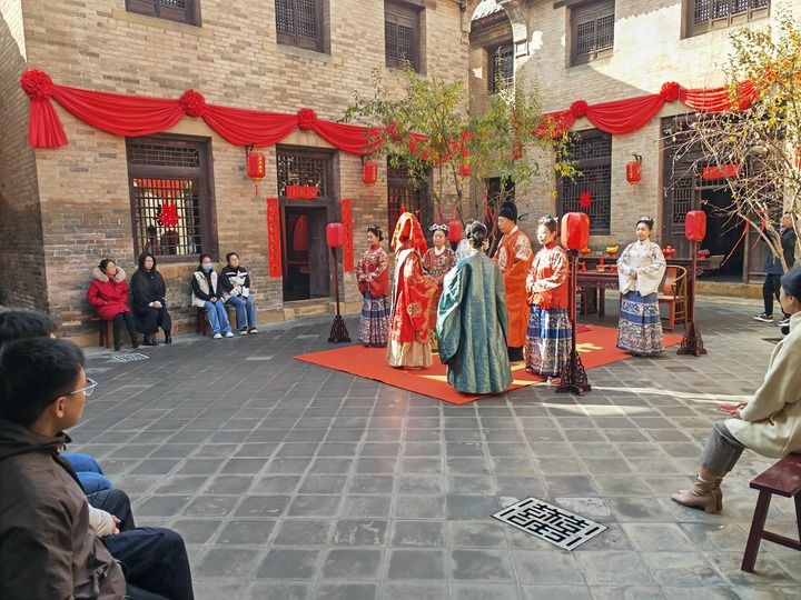 喜鎮(zhèn)蘇莊的古院落中,正在上演一場(chǎng)“出閣禮”表演,吸引游客前來(lái)參觀(guān)。新華每日電訊記者許雄 攝