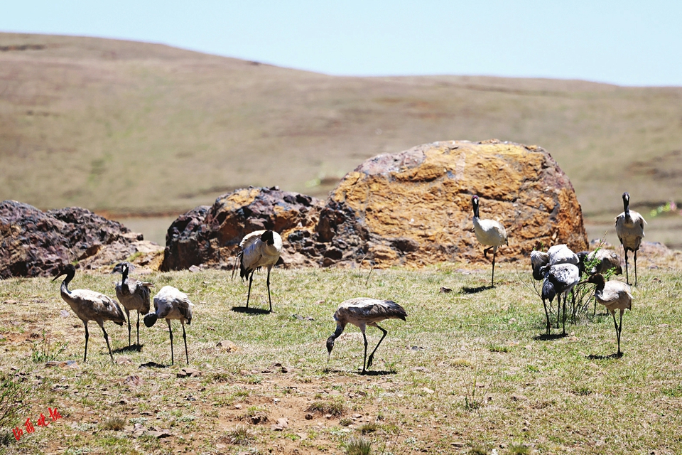 黑頸鶴是國(guó)家一級(jí)重點(diǎn)保護(hù)野生動(dòng)物,也是國(guó)際公認(rèn)的珍稀瀕危動(dòng)物,被稱為“鳥類大熊貓”。圖為5月3日在云南大山包黑頸鶴國(guó)家級(jí)自然保護(hù)區(qū)拍攝的黑頸鶴。