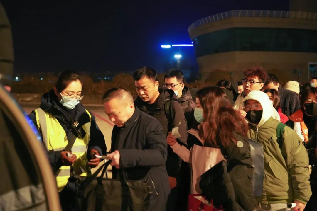為了早點(diǎn)回家,旅客們披星戴月,趕最早的航班。太原機(jī)場地服人員更是早早守候在停機(jī)坪,幫旅客檢票登機(jī)。