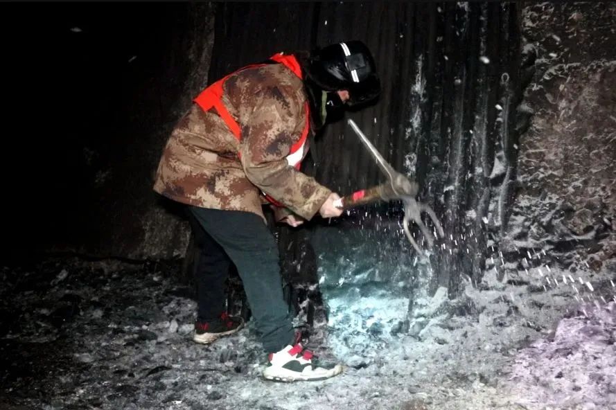 “咣當(dāng)咣當(dāng)……”,為了讓列車安全通過隧道,大同工務(wù)段的鐵路“打冰人”掄著尖鎬,狠狠地砸向拱壁上的冰柱,加緊隧道內(nèi)的除冰作業(yè)。
