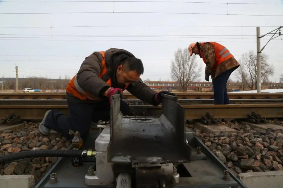 “放上木楔子,把道岔清理干凈!”為了保障春運(yùn)期間道岔平穩(wěn)運(yùn)行、列車安全暢通,鐵路信號工們加大道岔檢修力度,左手一把膩?zhàn)隅P、右手一瓶機(jī)油,為道岔進(jìn)行清潔保養(yǎng)。