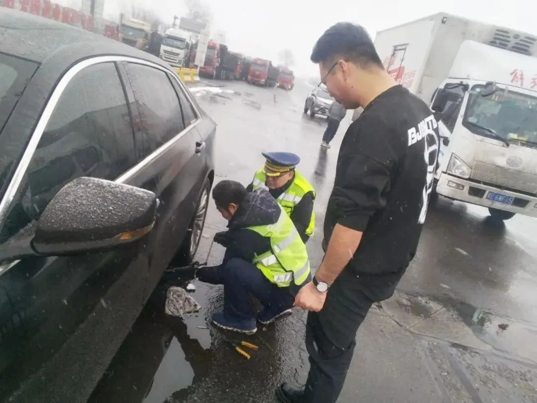 在汾陽西收費(fèi)站附近,一私家車主想要拆卸下防滑鏈,但不會操作,熱心的高速收費(fèi)員從站內(nèi)拿來拆卸工具,和治超員一起,幫車主拆卸下防滑鏈。