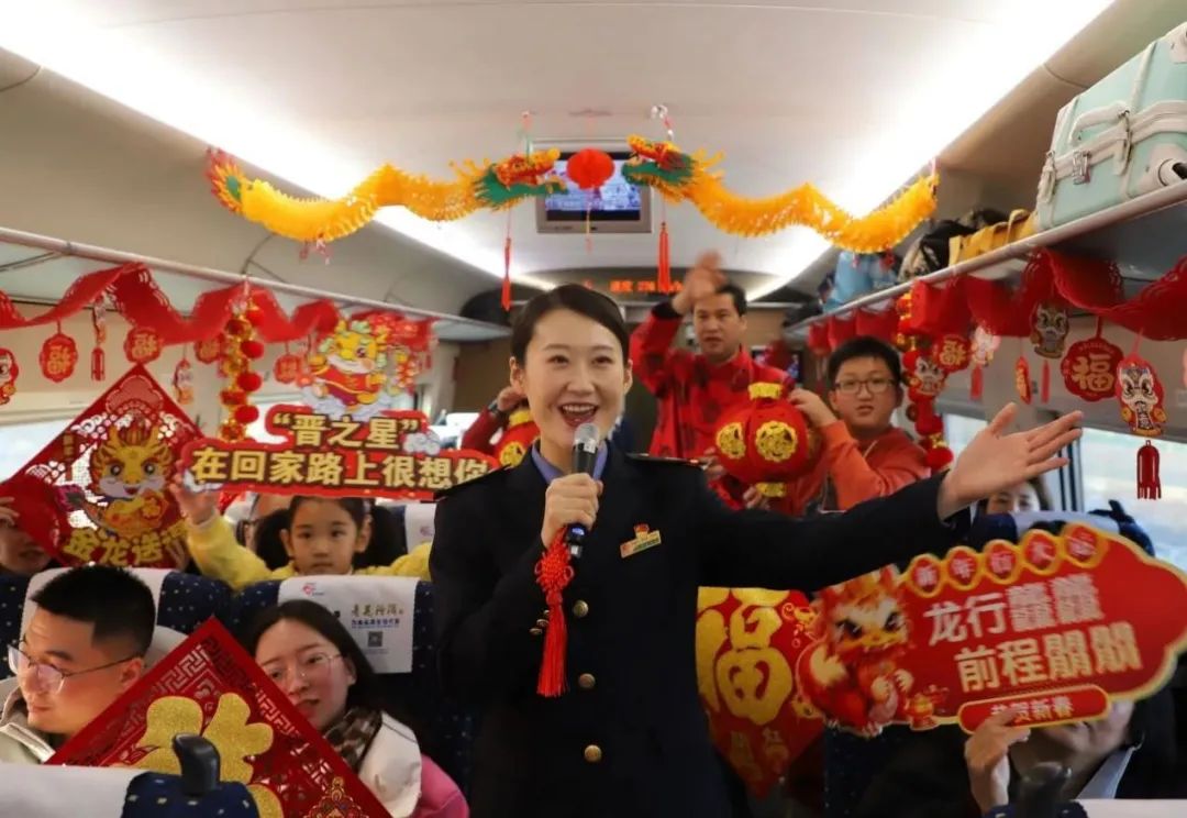 春運(yùn)首日,太原客運(yùn)段各次列車圍繞“龍行龘龘 旅程暖暖”主題,開展了精彩紛呈、喜慶熱鬧的列車文化活動?;丶衣飞希覀儾还聠?。