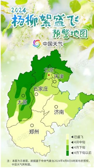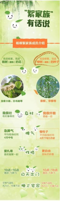 以華北地區(qū)最早開始飄絮的白毛楊為例,當(dāng)日平均氣溫大于0℃時(shí),白毛楊才能正常生長發(fā)育,將這些超過0℃的數(shù)值累加起來,當(dāng)總和達(dá)到480℃,且日平均氣溫達(dá)到14℃,楊絮就開始飄飛。華北一帶,往往4月上旬前后達(dá)到這一標(biāo)準(zhǔn)。楊絮飄飛10余天后,柳絮也會進(jìn)入飄飛期。