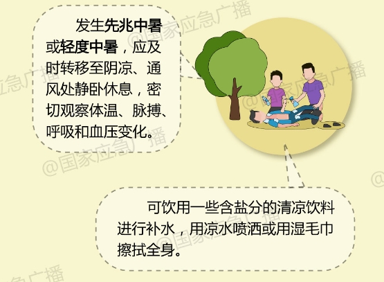 使中暑者在陰涼通風(fēng)處平臥,抬高下肢,及時(shí)快速降溫、補(bǔ)糖鹽水,謹(jǐn)防低血壓,保證重要臟器血供,盡快送醫(yī)。