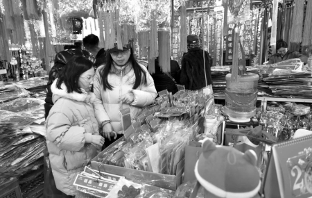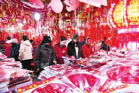 “今年蛇年,對(duì)聯(lián)和掛飾肯定以蛇元素為主,品類更加豐富,背膠和磁吸設(shè)計(jì),掛貼更為方便?!痹谔炒筚u(mài)場(chǎng),邢先生售賣(mài)春聯(lián)和窗花、燈籠等各類春節(jié)掛飾20多年了,一副副大紅的春聯(lián)掛滿了兩面墻壁,各類福字和掛飾鋪滿了整個(gè)攤位,顧客們正在選購(gòu)自己喜歡的春聯(lián)和掛飾。他說(shuō),今年的春聯(lián)和春節(jié)掛飾有大幾百種,豐富多樣。臘八過(guò)后,來(lái)購(gòu)買(mǎi)對(duì)聯(lián)和過(guò)年掛飾的人就開(kāi)始多了起來(lái),預(yù)計(jì)年前一周左右會(huì)達(dá)到高峰。