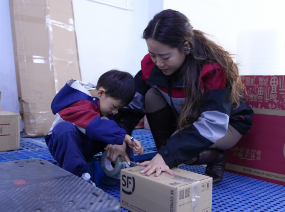 34歲的閆詩琪,作為山西順豐核馨苑營業(yè)店的快遞員,每日穿梭于各個小區(qū)之間,忙碌地收派包裹。5歲的兒子辰辰,在活動當(dāng)天跟著媽媽踏上了快遞派送之旅。當(dāng)辰辰看到媽媽裝滿一車廂的快遞,得知這只是上午的任務(wù)量,下午還有更多時,滿臉的驚訝寫滿了對媽媽工作量的難以置信。