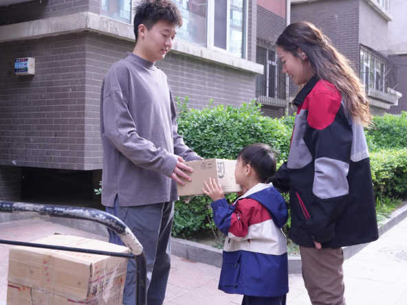母子倆戴上頭盔,奔赴第一個派送點(diǎn)。到達(dá)小區(qū)后,面對要送2件、取1件的任務(wù),辰辰興奮地自告奮勇抱起快遞跑進(jìn)樓道,卻很快被現(xiàn)實(shí)“上了一課”——沒有電梯,收件人住在5層。當(dāng)他送完這家,額頭滿是汗水,步伐也明顯跟不上媽媽了。出了小區(qū),辰辰一句“真累呀,還有那么多,得送到啥時候啊”,道出了孩子對媽媽工作艱辛的初步體會。而閆詩琪輕撫兒子頭說道,“孩子,干啥工作也要有耐心。”不僅是對兒子的鼓勵,更是她日常工作的真實(shí)寫照。