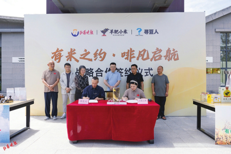 羊肥小米董事長(zhǎng)杜紅雁與云南尋豆人董事長(zhǎng)郭濤簽訂合作協(xié)議。