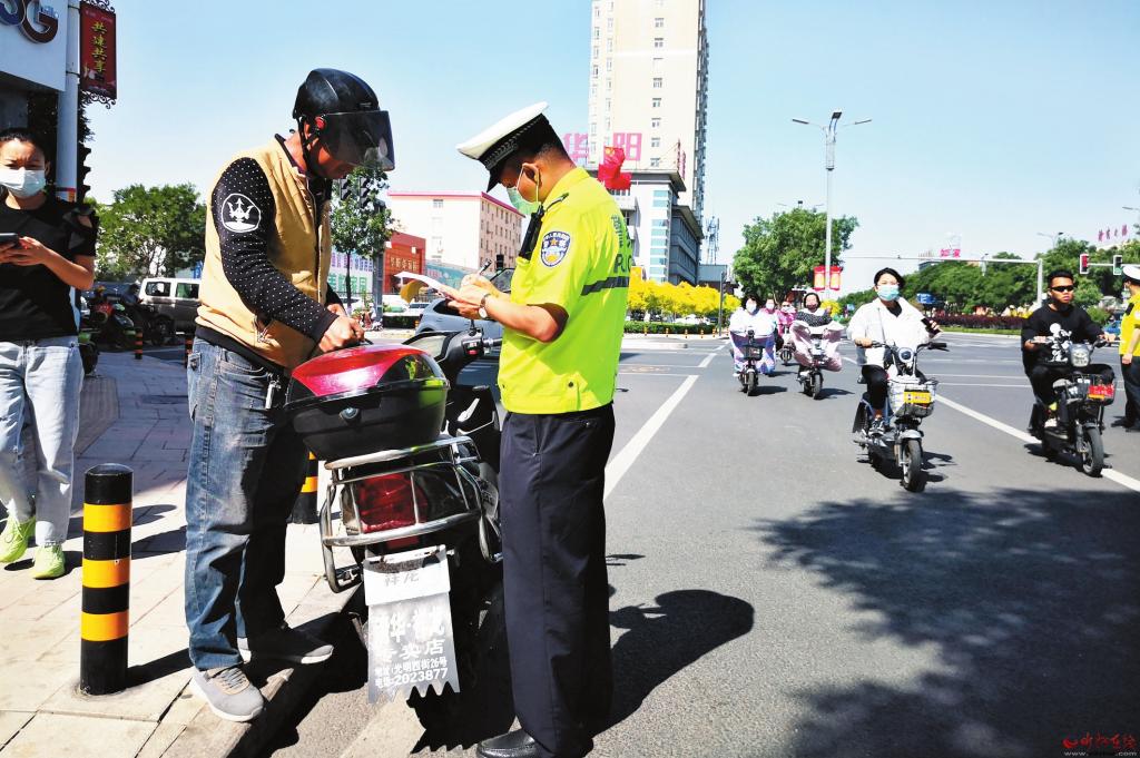 個別市民為了搶幾十秒時間,少走幾百米路,騎電動車闖紅燈、逆行,結(jié)果收到交警的罰單。5月27日,在城區(qū)建設(shè)路與長征街路口,執(zhí)勤交警一邊開罰單,一邊苦口婆心地勸說交通違法者:“為了自己和他人的安全,一定要遵守交通法規(guī),摒棄交通陋習(xí),遠離交通事故?!保ㄓ浾?張劍雄 攝)